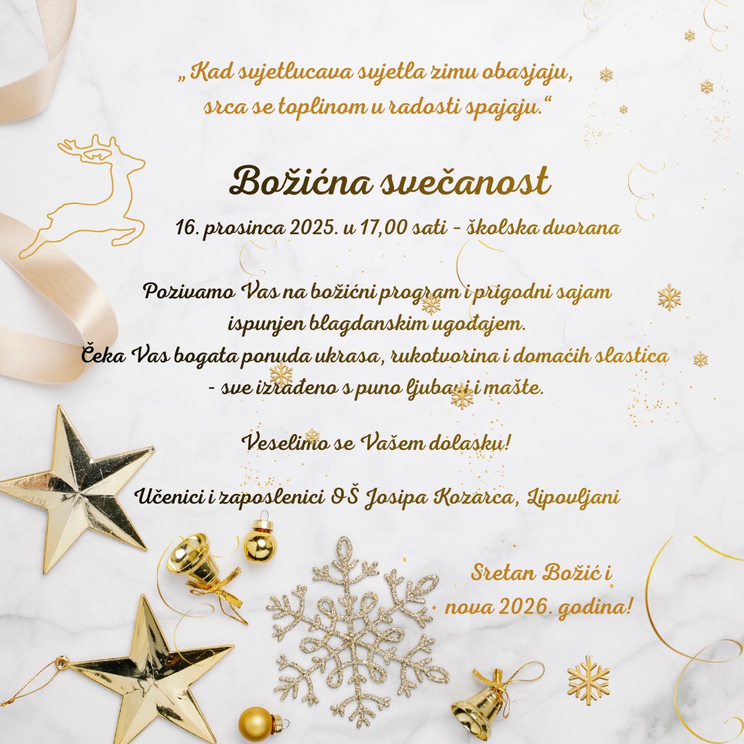 Božićna priredba učenika OŠ Josipa Kozarca održat će se u utorak, 16. prosinca, u školskoj dvorani s početkom u 17:00 sati.